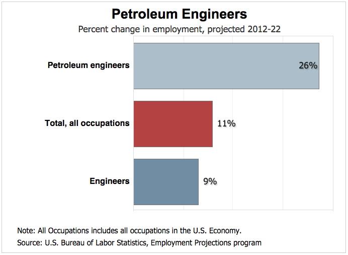 Not only is the pay good–the demand for petroleum engineers is climbing. The BLS projects that employment of petroleum engineers is projected to grow 26 percent from 2012 to 2022, significantly higher than the 11 percent growth rate projected across all occupations.