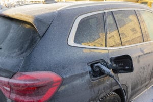 Close Up View Of Electric Car Connected By Cable From Charging S
