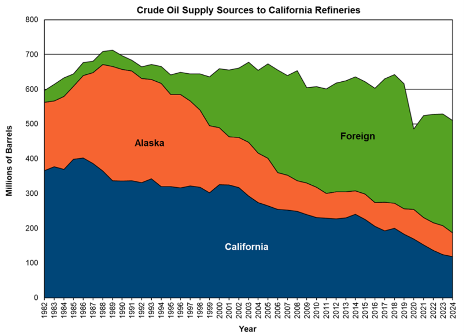 In 1988, approximately 95% of the oil supplied to California refineries came from California and Alaska. Today, 63.5% comes from foreign sources — with 21% from Iraq, 5% from Saudi Arabia, and 4% from the UAE. That’s the chart Newsom should be showing in his X posts (and the chart below is from the state of California):