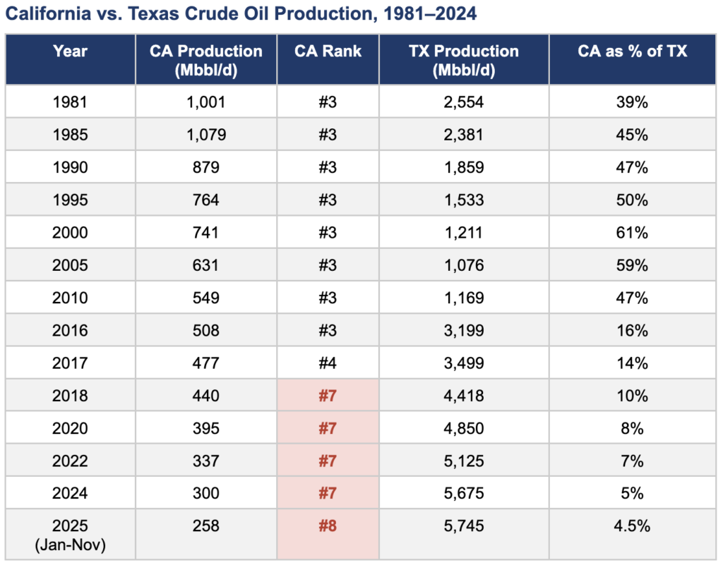 What has happened since the 1980s is a policy-driven catastrophe. California’s oil production has almost fallen every single year for nearly four decades, dropping from 1,079 Mbbl/d in 1985 to just 300 Mbbl/d in 2024 — a decline of 70%. The state slipped from #3 to #4 in 2017 when North Dakota overtook it. Then the shale revolution transformed the rankings, and New Mexico, Colorado, and Oklahoma all surpassed California. By 2018, California had fallen to #7, where it remained until last year, when Wyoming also surprised California.
